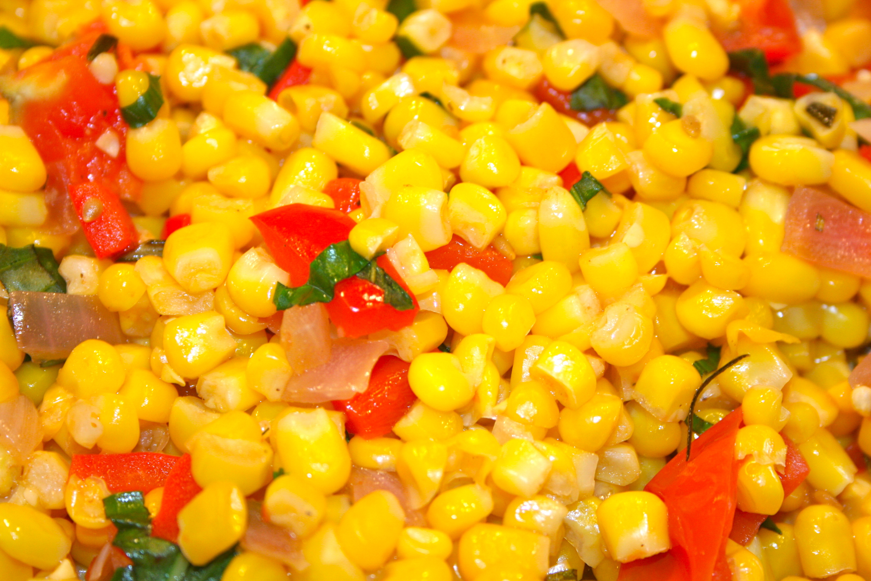 I made a great side dish, perfect during the summer months when fresh corn on the cob is abundant and basil is growing out of control. It looks so colorful on the plate, this summer side pleases the whole family. You can easily substitute frozen corn for the fresh. It does take a bit of time to cut the kernels off the cob. They make a gadget for that… If you’re in a rush, just use frozen. I don’t know if canned corn would work, I don’t usually buy canned veggies.