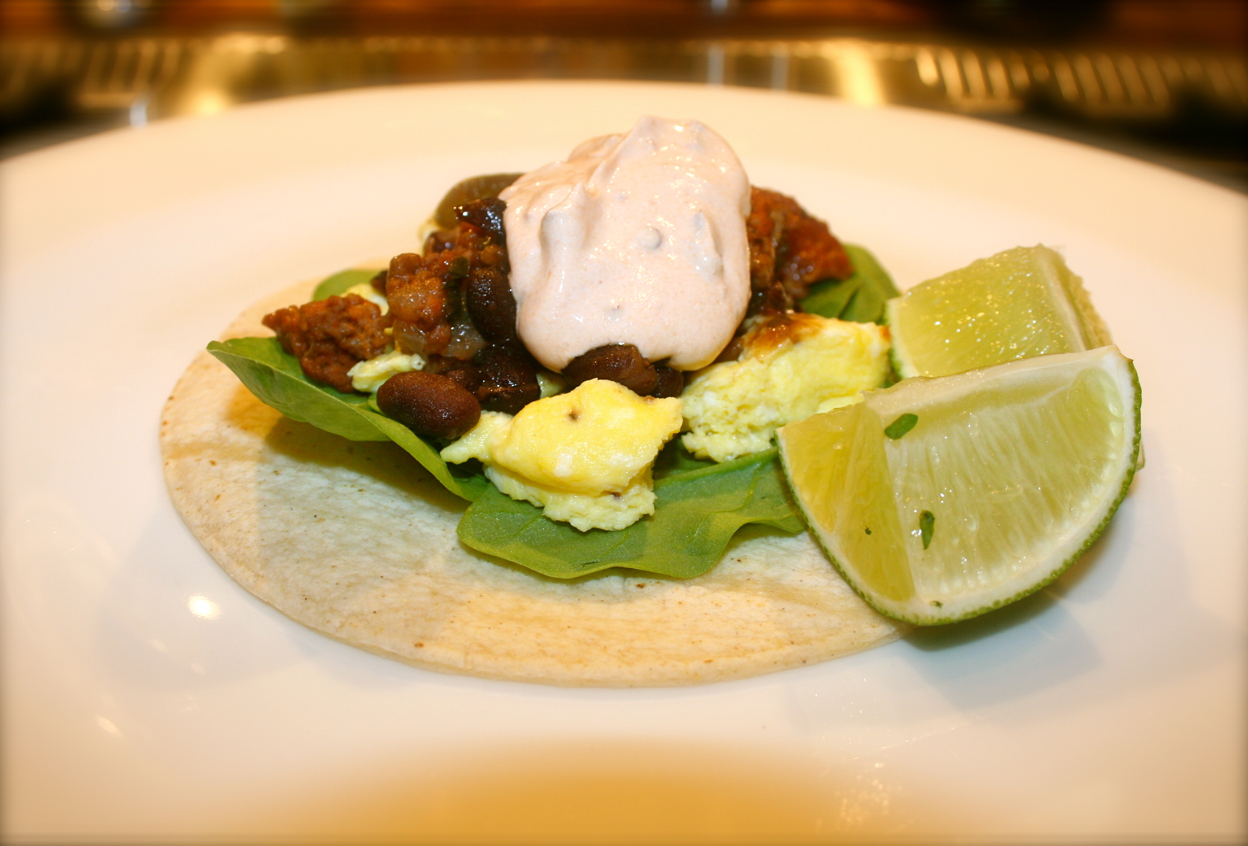 Layer fresh spinach and eggs on top of warm tortilla and top with the beans. Add a spoonful of the chipotle cream and a squeeze of fresh lime to top it off. I guess it’s kind of like a soft taco. Very yummy!