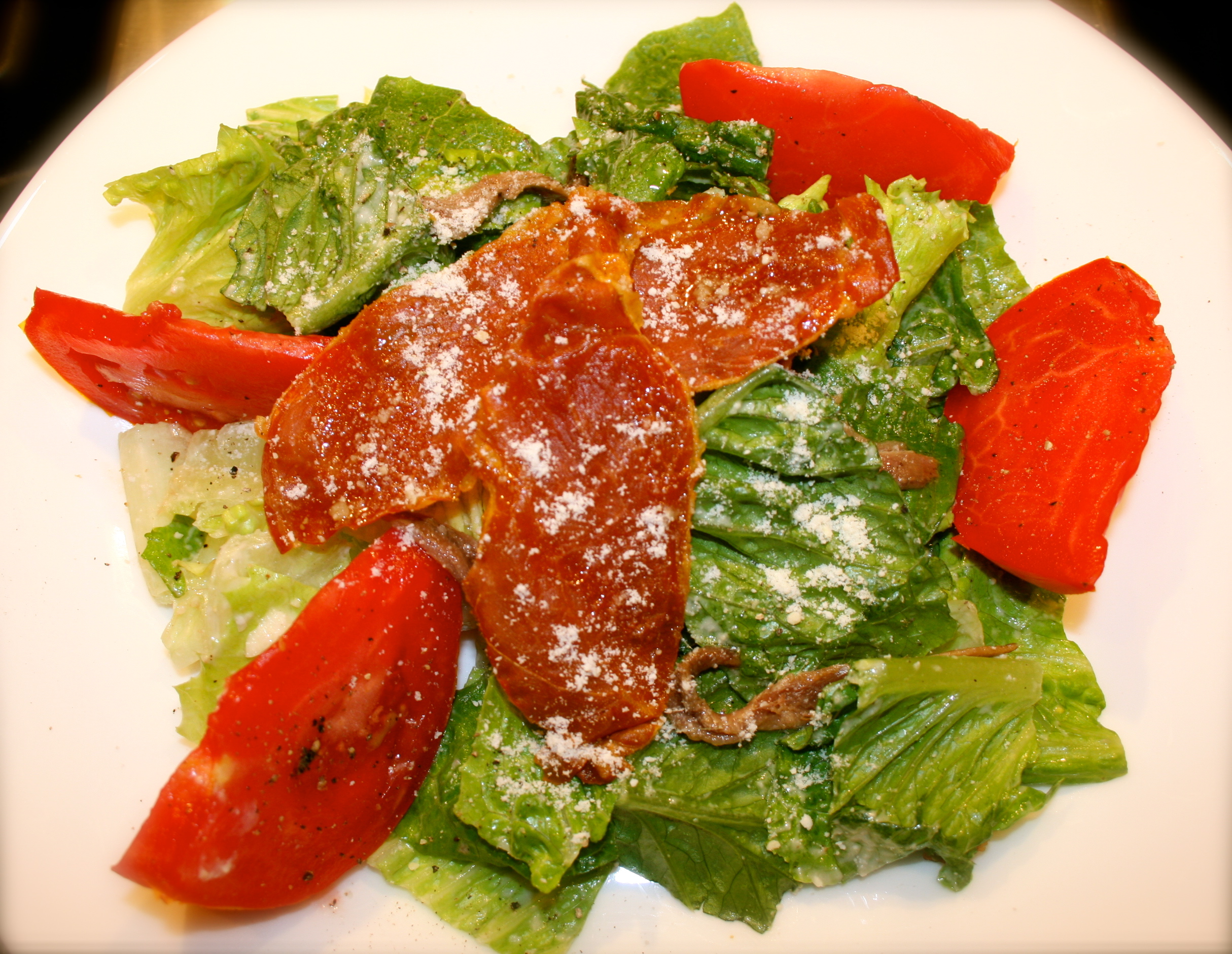 To make the salad, cut romaine and toss lightly with some of the dressing. Top with anchovies, additional parmesan cheese, freshly ground pepper and stack the prosciutto on top. Garnish with tomato wedges around the salad.