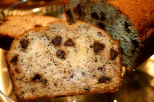 * A couple of notes… you can also add raisins which I love and my family hates. Or you can add nuts (chopped walnuts are nice). I’ve made this with all three (chocolate chips, raisins and nuts), and then you can call it Banana Junk Bread. Yum! Depending on how large your bananas are, when the bread bakes it will crack along the top and may seem under done along the center crack. If your toothpick comes clean everywhere else but in that center part – it’s done.