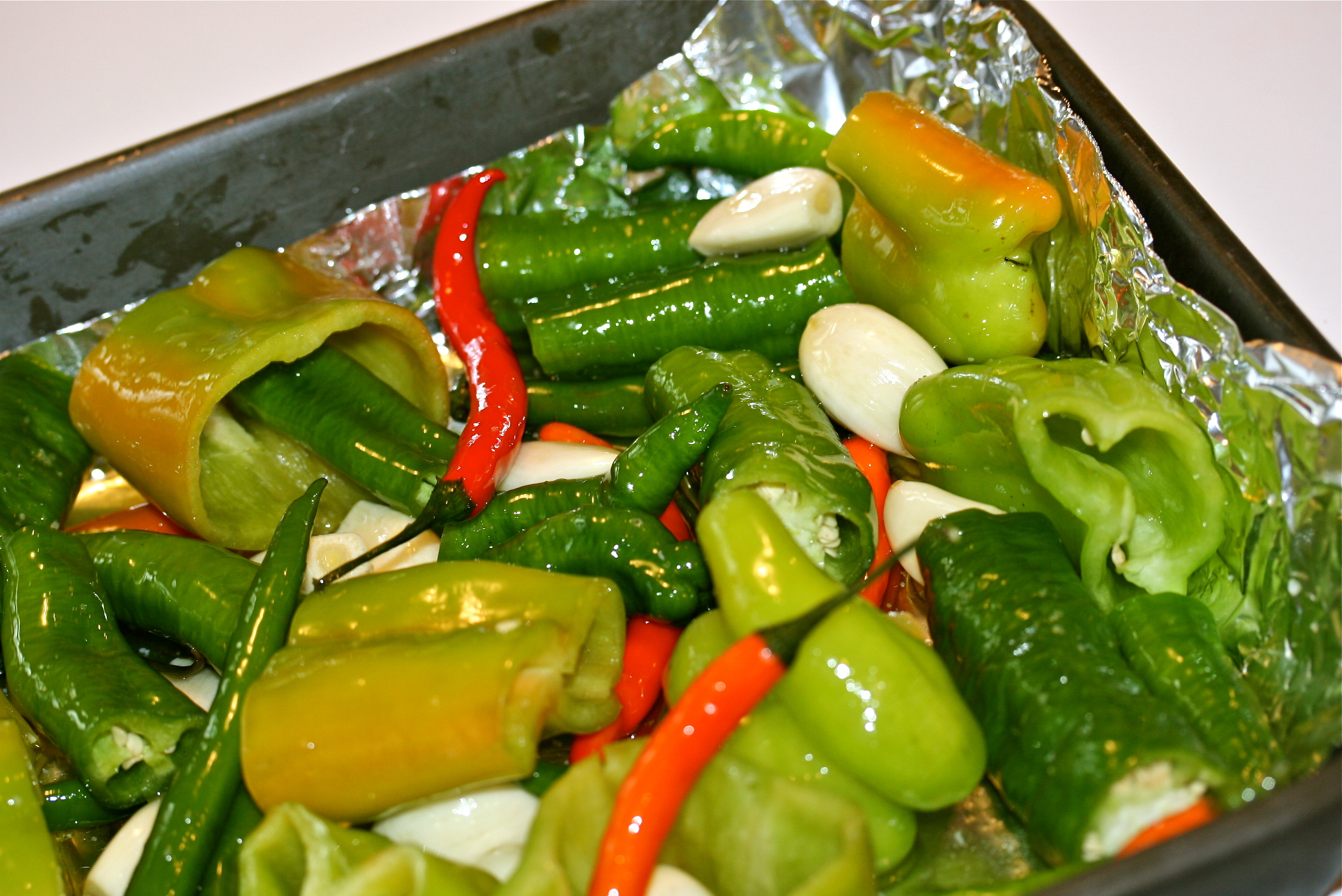 To prepare the peppers: for cubanello/frying peppers, remove the core and cut in half or into thirds – like big rings. Cut long hots into 2 inch chunks or thirds, keeping seeds intact. Any small chilies can be left whole. Line a large baking dish with foil and add the peppers and whole peeled garlic cloves. Drizzle with enough olive oil to coat and give it a generous sprinkle of coarse salt. Using your hands, toss everything around ensuring it’s completely coated.