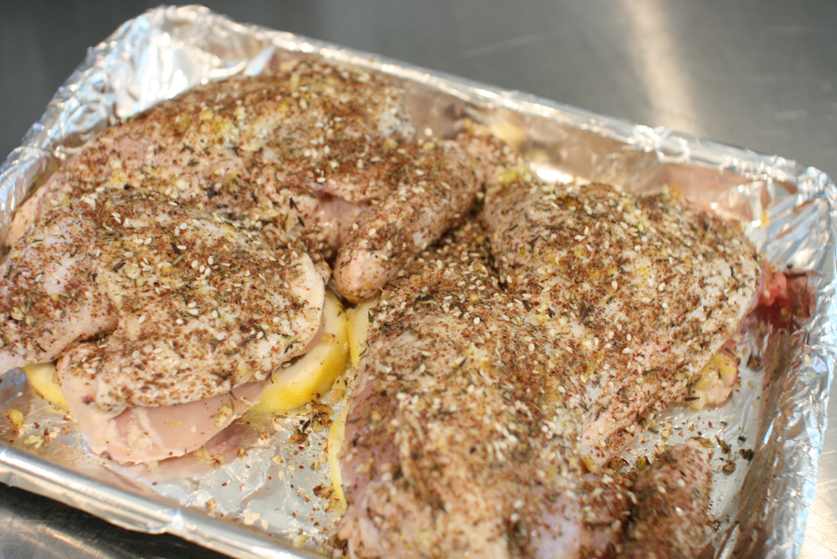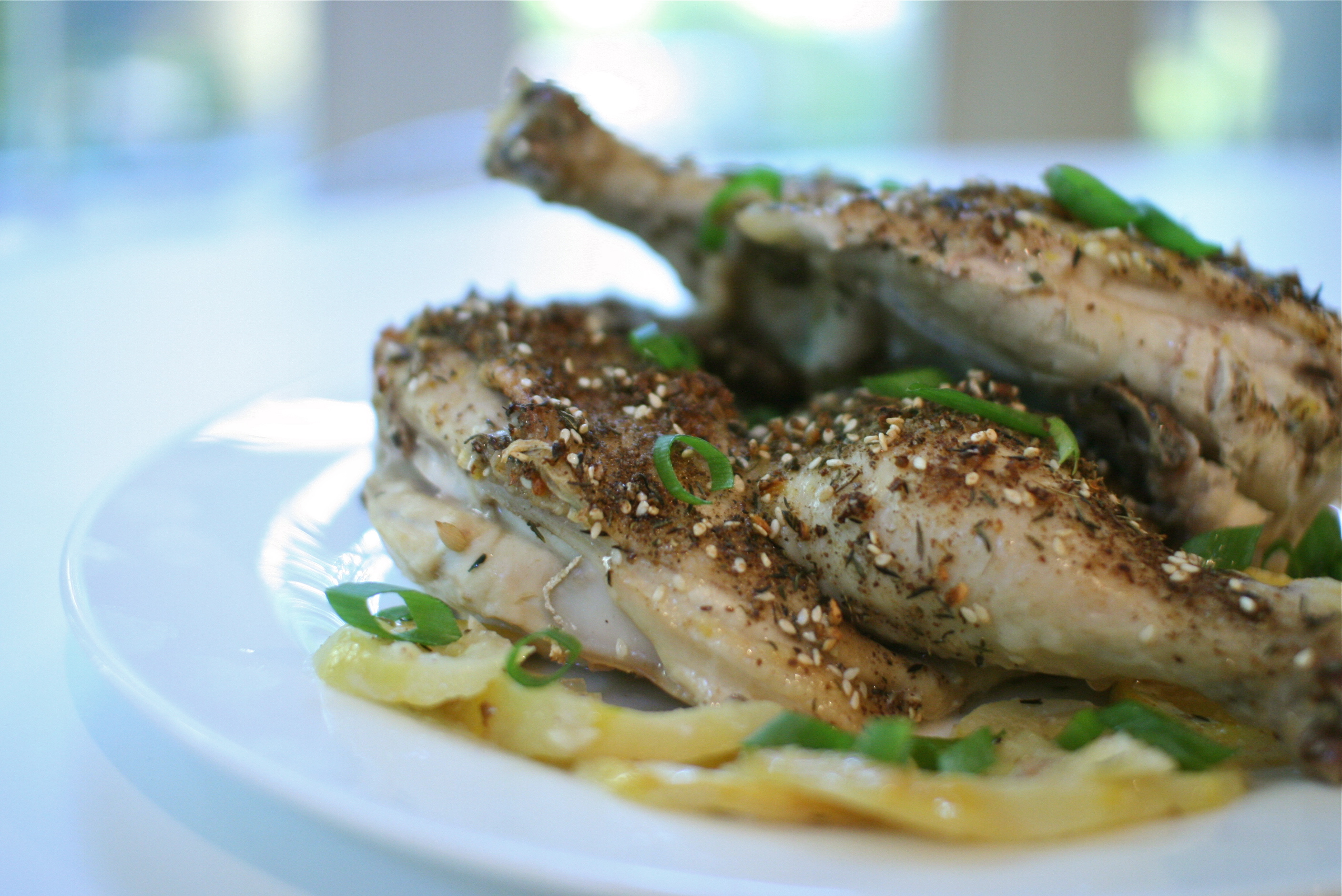 Remove the backbone from the chicken and cut it in half… or you can have your butcher do it for you. Chop the garlic and lemon zest together. Carefully run your fingers under the skin of the chicken and put the lemon zest and garlic mixture under the skin. Rub the outside of the chicken with a little olive oil and sprinkle the za’atar all over the chicken, rubbing a little under the skin.