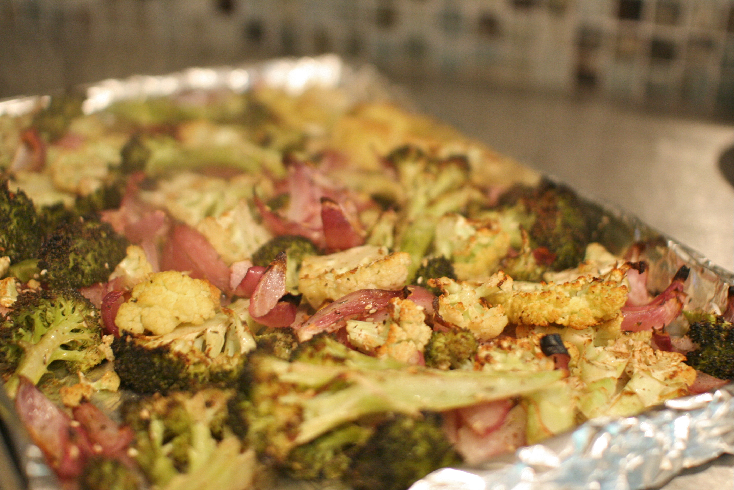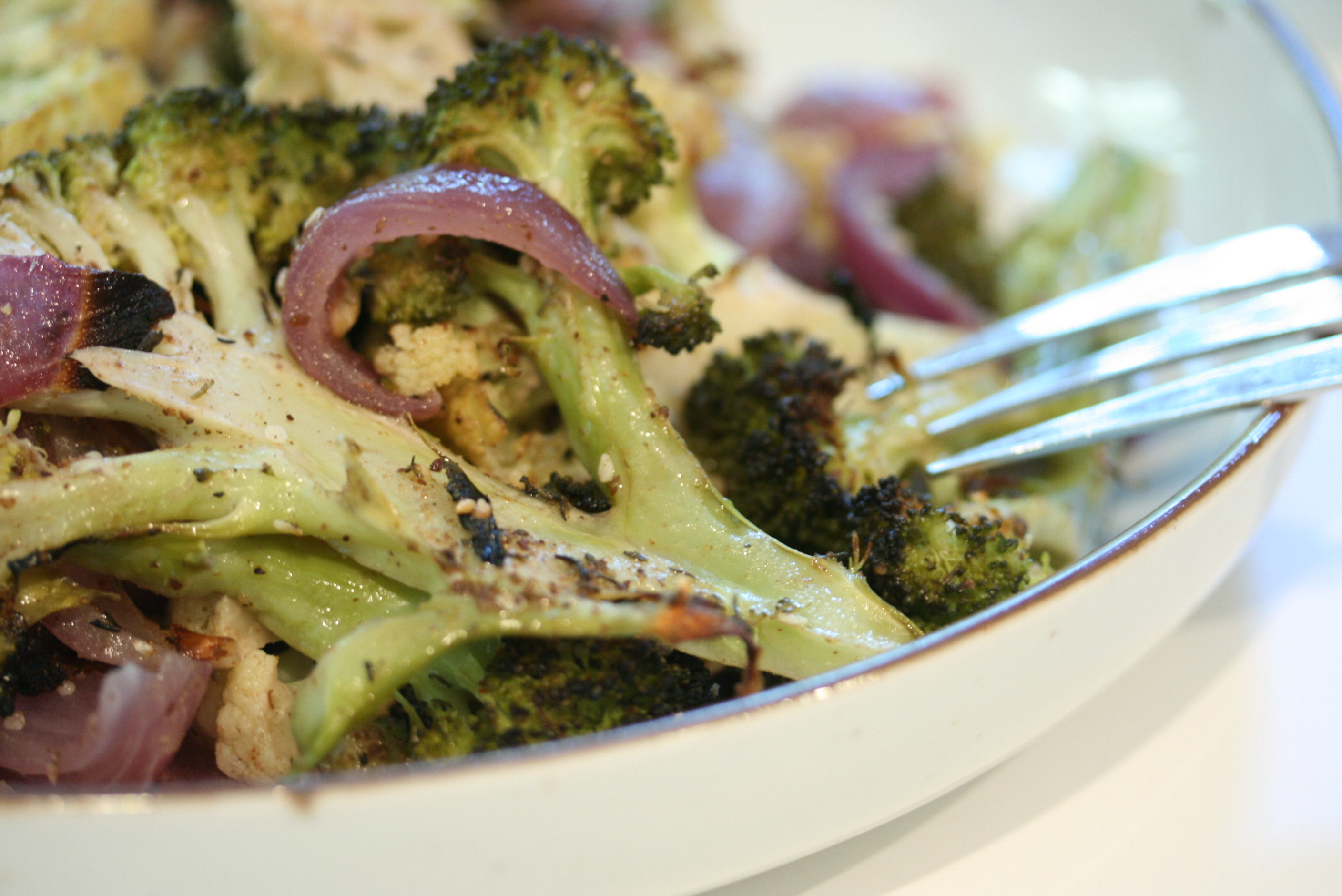 Cut the vegetables in wedges… almost like little trees. I like to keep a nice amount of the stems on, they’re just as delicious as the tops. Lay the broccoli, cauliflower and onions on a sheet pan. Drizzle with the olive oil and sprinkle with the za’atar . Using your hands, toss the whole thing together to make sure it is evenly coated with the oil and spices. Roast in the preheated oven for about 20min or until the veggies are browned on the edges and tender.