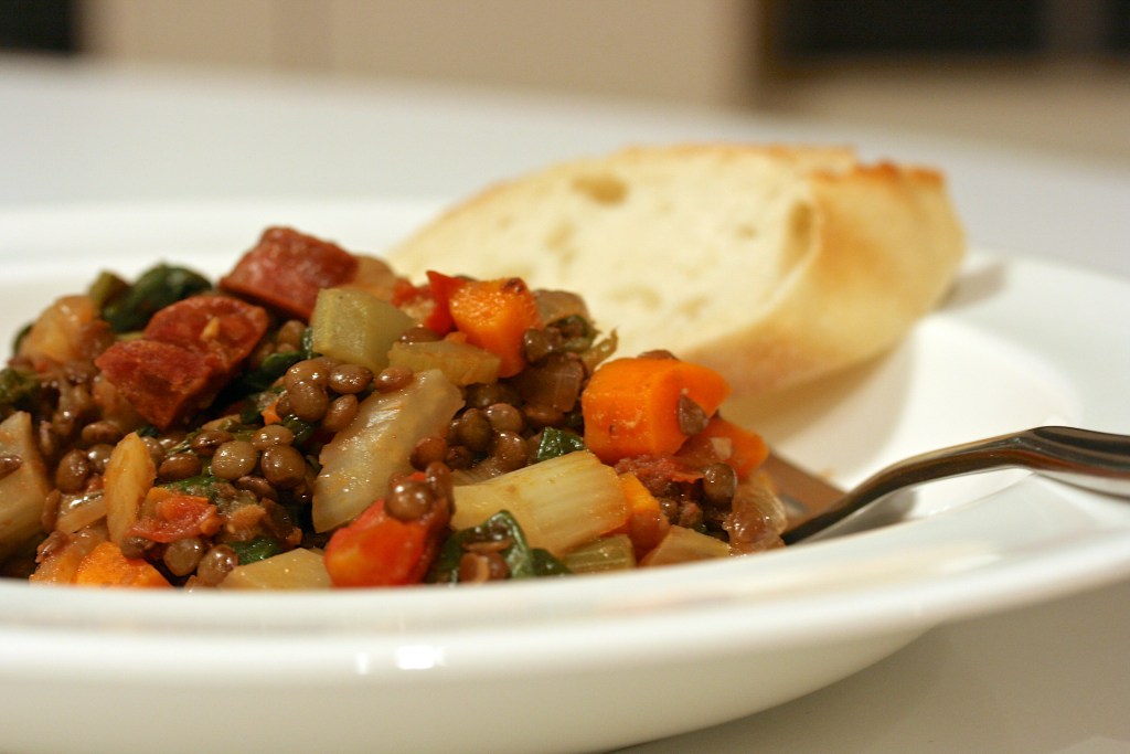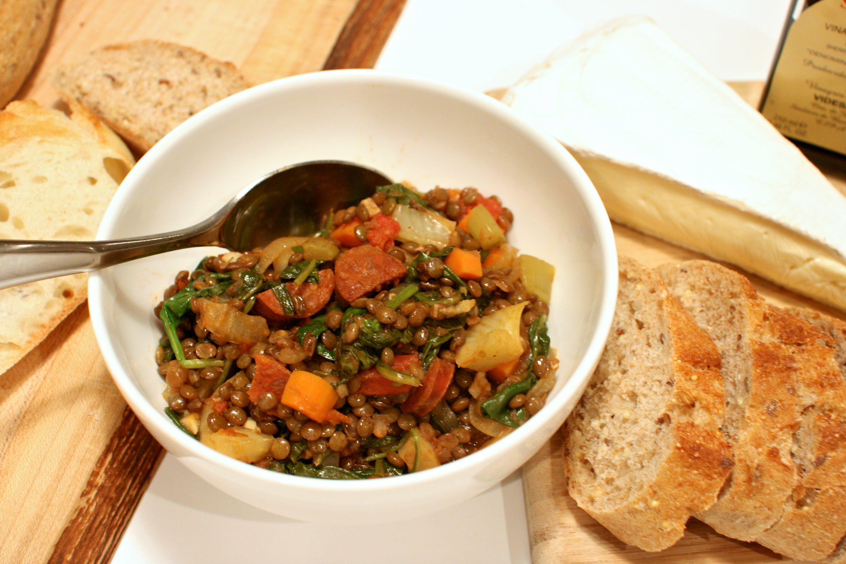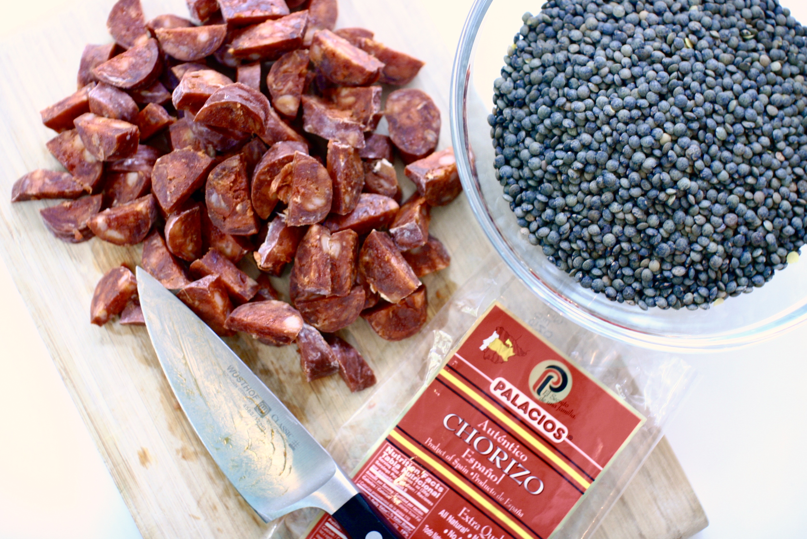 This lentil dish fulfills one of my healthy cravings. Lentils and spinach, two super foods! Obviously, the chorizo adds a bit of sin and fat, but it packs serious flavor. You can certainly make these lentils without it, which I have, and they’re equally delicious. This also makes a perfect side dish. If you want to use chorizo, I recommend the brand above. For my Bucks County locals, you can find it at Jamie Hollander Gourmet Foods in New Hope, PA or None Such Farms in Buckingham, PA. If you can’t find sherry vinegar, you can substitute red wine vinegar.