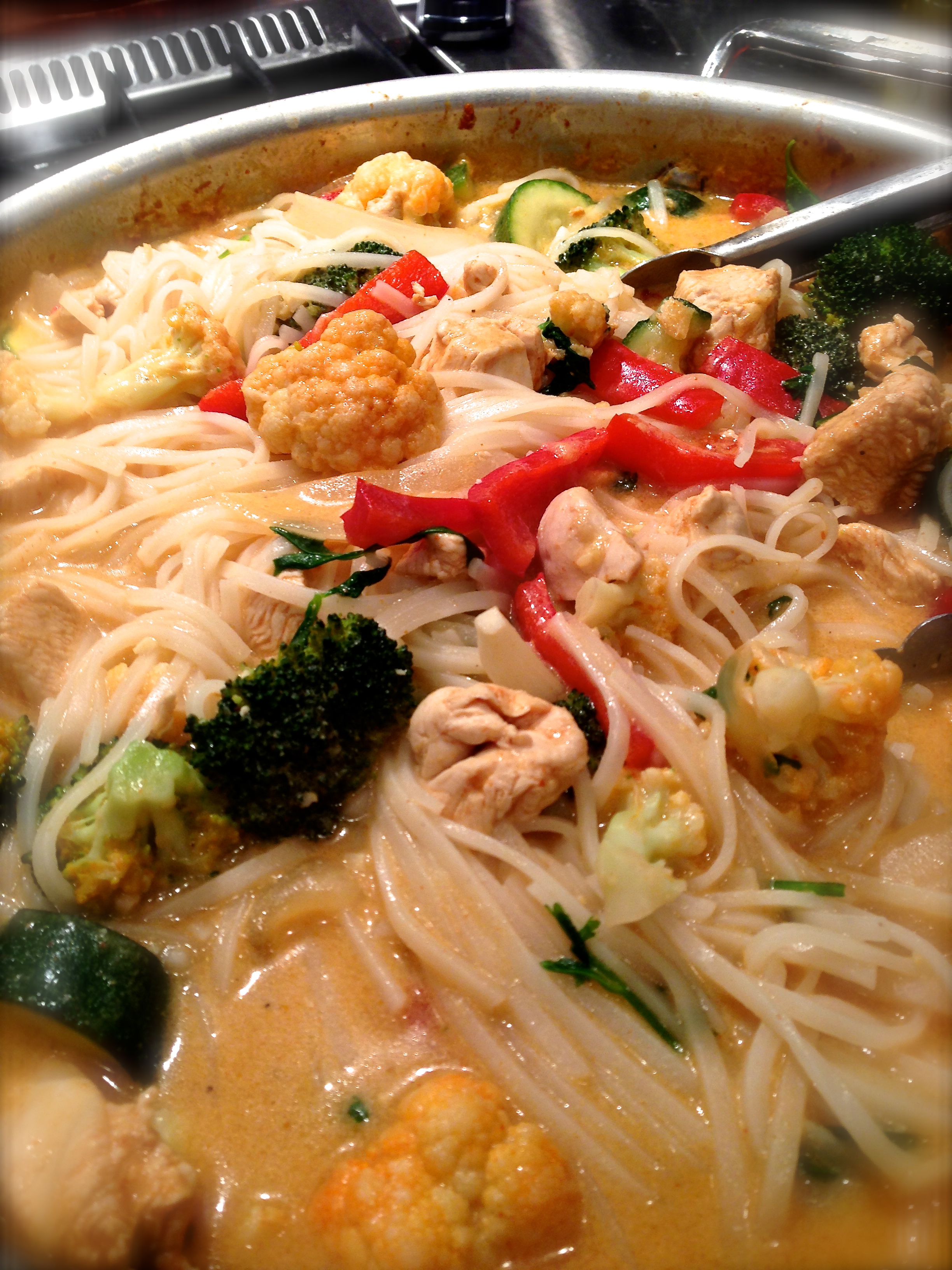 Pour in the coconut milk (remember to shake the cans before opening), add the remaining chicken stock and the fish sauce mixture. Stir to combine and simmer 10 minutes or until the chicken is properly cooked through. While you’re waiting, cook the rice noodles according to package instructions.