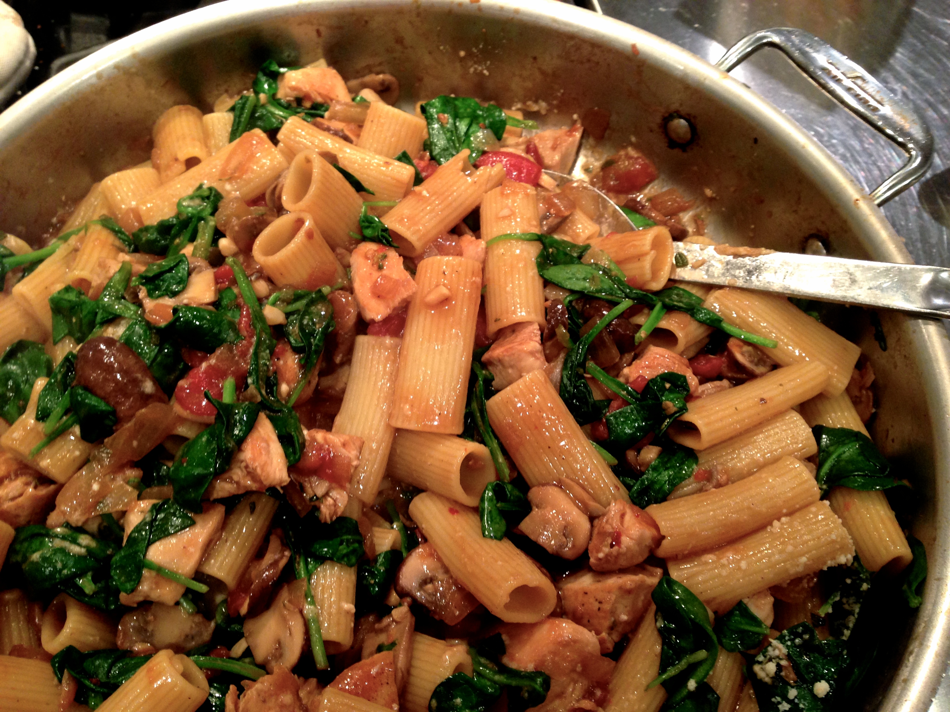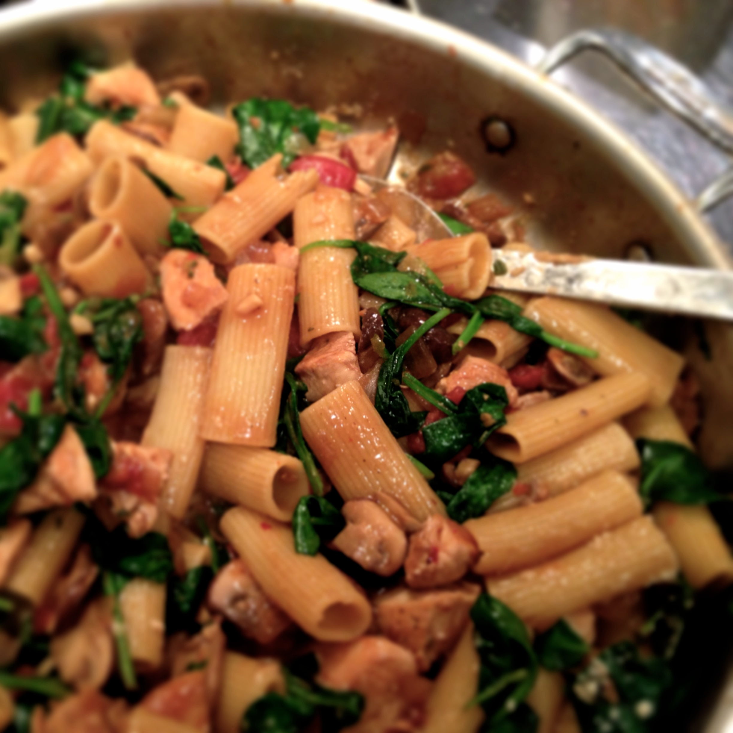 The cremini mushrooms looked particularly fresh, so I filled a bag and grabbed some other ingredients that I thought would work to make a pasta dish. I already had spinach in my cart and decided to grab some chicken breasts. I know there are many pasta recipes out there with chicken and spinach, but I threw this together on a whim (no recipe) and have to admit it was pretty awesome! It’s a fast one, good for a weeknight dinner. The whole family loved it.