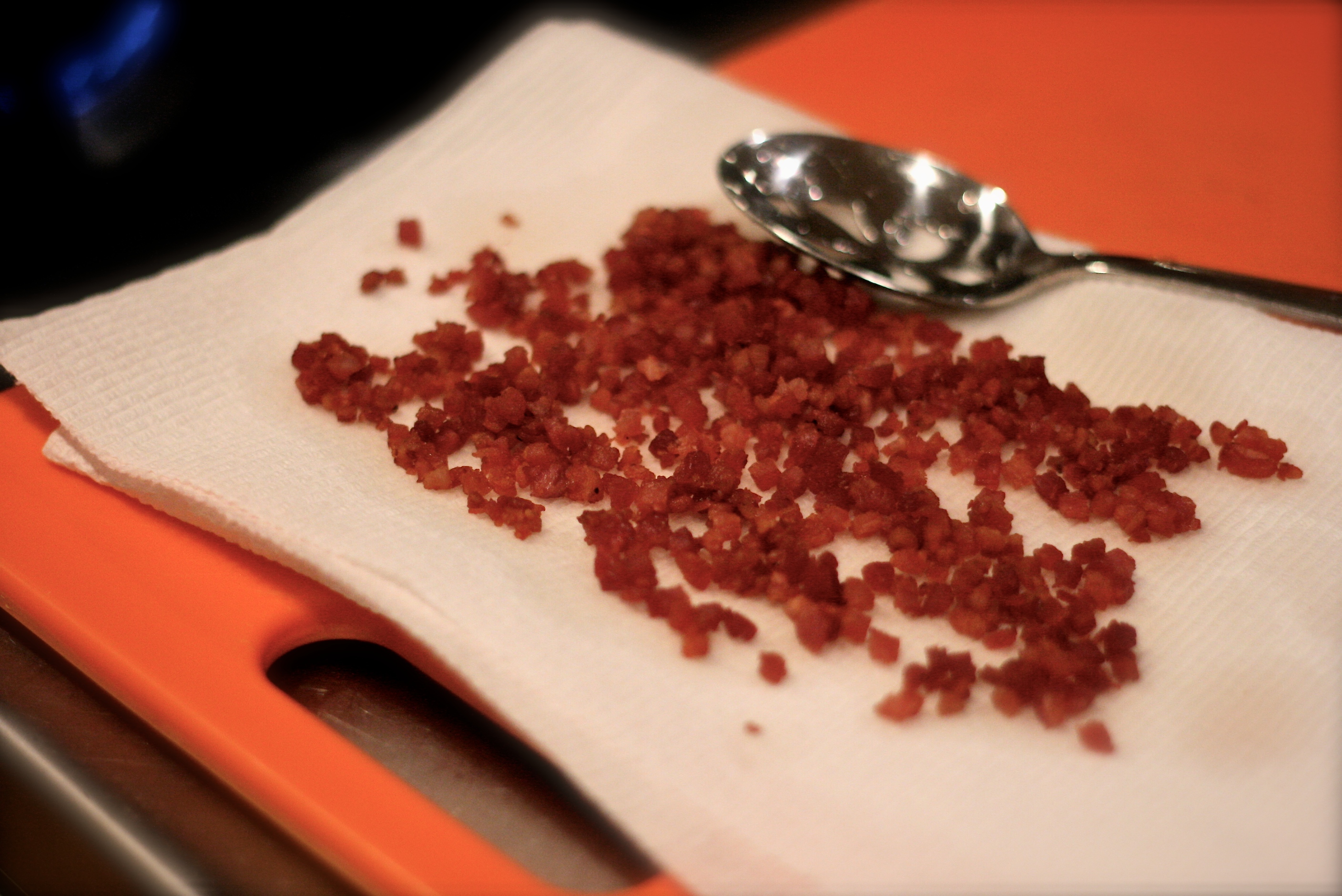 3. Preheat a small skillet on medium-high heat. Saute the diced pancetta. You don’t need any oil in the pan. Once the pancetta becomes nice and crispy, transfer it to a paper towel lined plate using a slotted spoon. Set the pancetta aside.