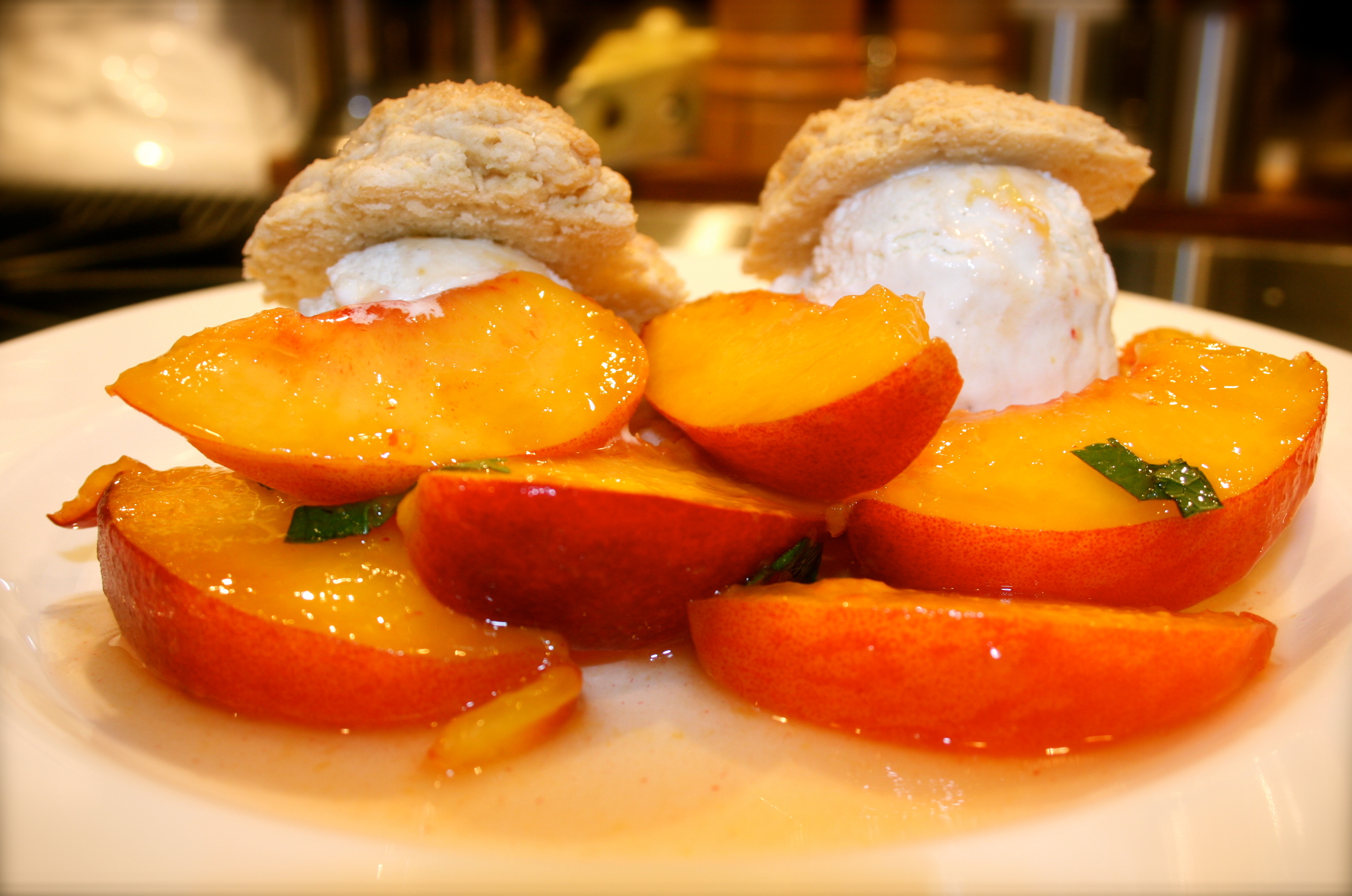 How good does that look! These shortcakes were adapted from an Alton Brown recipe. I’ve also made this with strawberries, which is equally delicious. Fruits will always taste best during the height of the season. I love the intense flavor of macerated berries, so I thought I would give it a try with peaches. I’ve found two methods to macerate fruit. One using either wine or liqueur such as Grand Marnier or a simple combination of sugar, water and a little citrus. With our kids being my blog recipe victims, I used the sugar method for this. It brings out the sweetness in the peaches, combined with the freshness of the mint… it was a perfect summer treat.