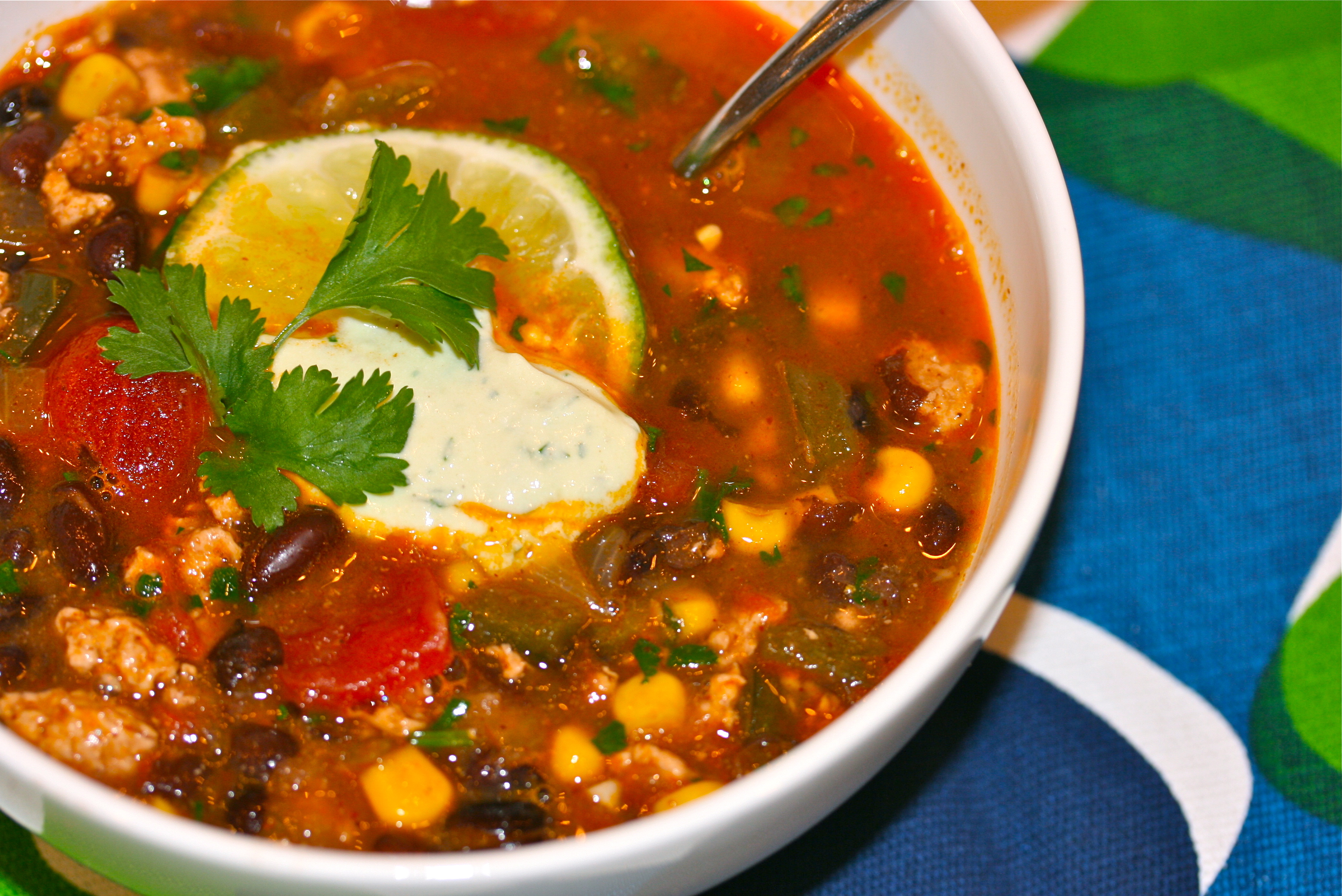 Add a little olive oil to a large stock pot on medium-high heat. Add the ground chicken and cook, stirring frequently. There shouldn’t be much fat released from the chicken as it cooks. If there is, drain a bit of the grease off. Once the chicken is cooked, add the green and poblano peppers and onion. Cook until softened, then add the garlic. When garlic becomes fragrant, about a minute, add 1/2 of the black beans. Using the back of a wooden spoon or a potato masher, mash the beans – this will help thicken the soup. Add the other half of the beans along with all the remaining ingredients except the cilantro. Stir well to combine and bring to a boil. Immediately reduce to a simmer and cover, cooking for 30 minutes. Taste for seasoning and cook for an additional 30 min. Serve with a dollop of avocado cream and some chips on the side.